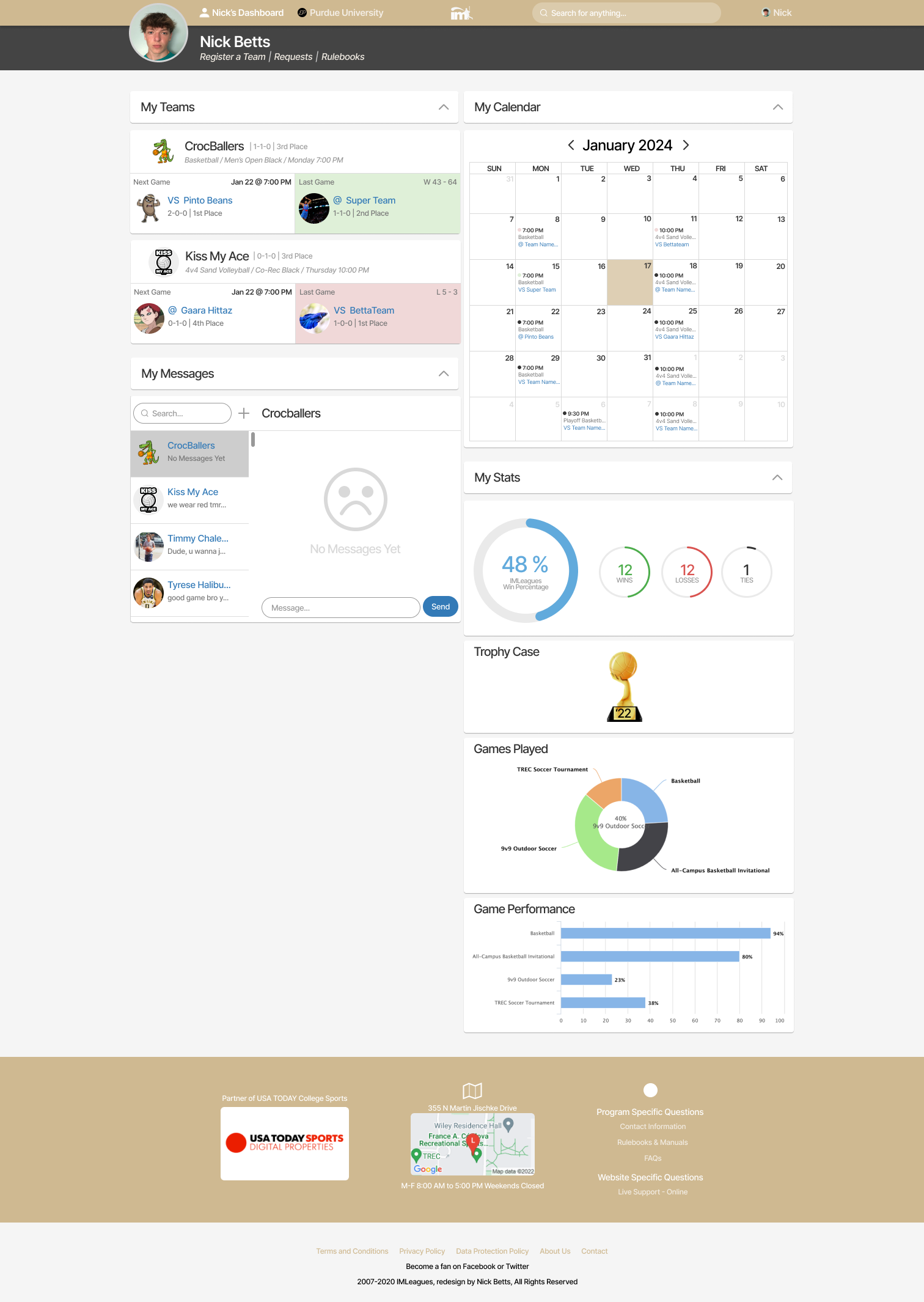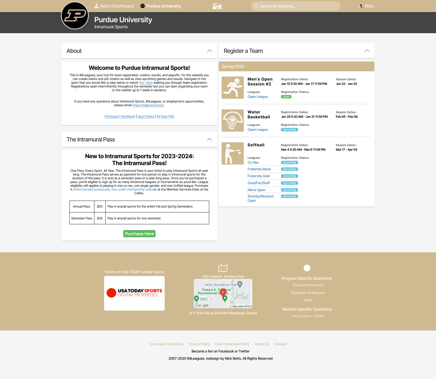 The IMLeagues website, used by Purdue University and many other schools for intramural sports is clunky, outdated, confusing, and filled with seemingly useless features like polls and announcements. The website is difficult to navigate, which makes what should be simple tasks like logging in, registering teams, and finding rulebooks very frustrating. As seen in the video above, the current login process is incredibly complicated, with many pages to navigate through just to get to your homepage.